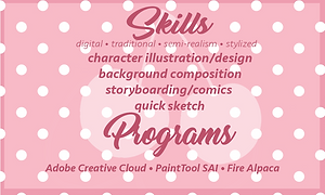 My strong suits lie within Character Design, Storyboarding, Conceptual Art, and quick sketching, although I'm willing to try many more things! My preferred programs are Adobe Creative Cloud, Paint Tool Sai, and FireAlpaca.